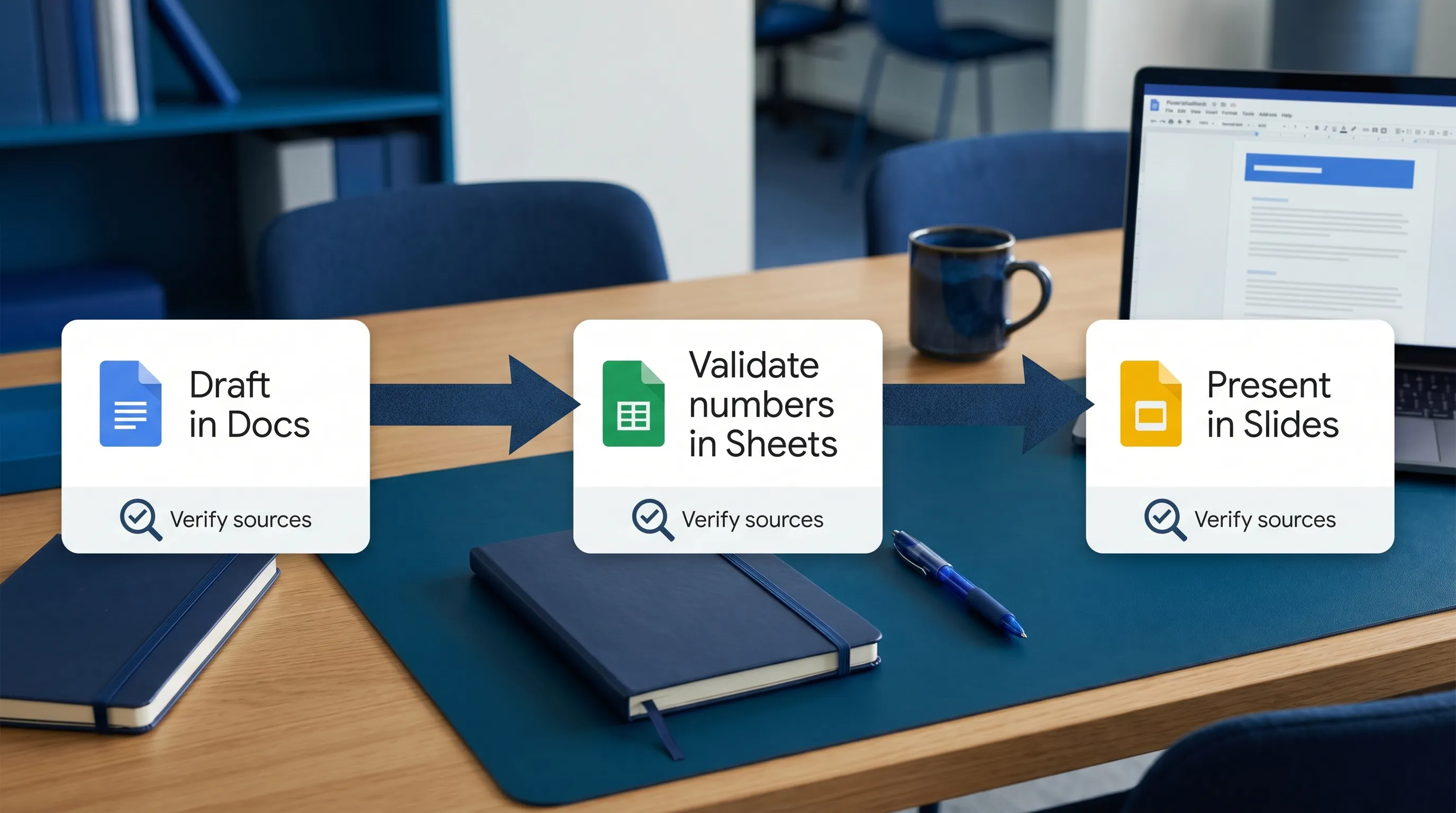 This workflow works because Sheets stays the source of truth, Docs becomes the review artifact, and Slides becomes the communication layer.